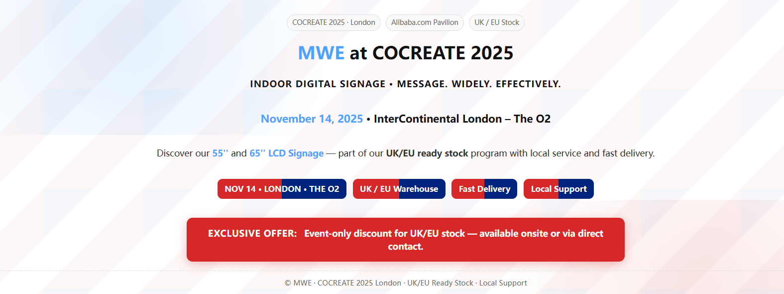 founded in 2008, is at the forefront of LCD digital signage solutions with our proprietary brand,"MWE". With a global reach in over 150 countries, we've pioneered the innovative OMC Outdoor Cloud System, designed for seamless operation in outdoor and remote environments. Discover our cutting-edge products on leading e-commerce platforms like Amazon and eBay.